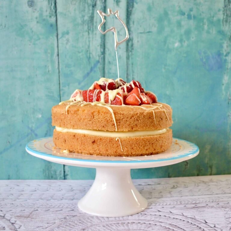 Rather than a traditional vanilla frosting and jam filling I’ve made a dairy free white chocolate frosting, strawberry jam and topped it all with some fresh strawberries and raspberries.  Dairy free white chocolate used to be quite hard to find but I’ve noticed a lot of supermarkets now have it has part of their free from section.