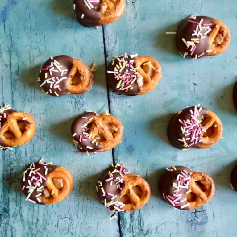 Hope you are all having a good week so far. Tonight’s recipe is a late addition to what I was going to release this week. My original plan included what I was going to call a fruit pizza. I thought it would be a good idea to cook a giant cookie, top it with a sweet cheesecake cream and then decorate it with pretty different coloured fruit. That was how it worked in my head – unfortunately the reality of the situation was pretty different. The giant cookie crumbled into a million pieces as I removed it from the oven immediately throwing me into a dramatic over the top rage. I think that recipes needs a bit more work before I share it wider! Anyway I’ve replaced it with this super quick snack idea which is a firm favourite of mine. I love the combination of sweet chocolate and salty pretzels.