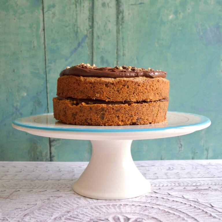 A beautiful sponge cake packed with little bits of chocolate and peanut topped with rich and creamy chocolate frosting – and all gluten and dairy free.