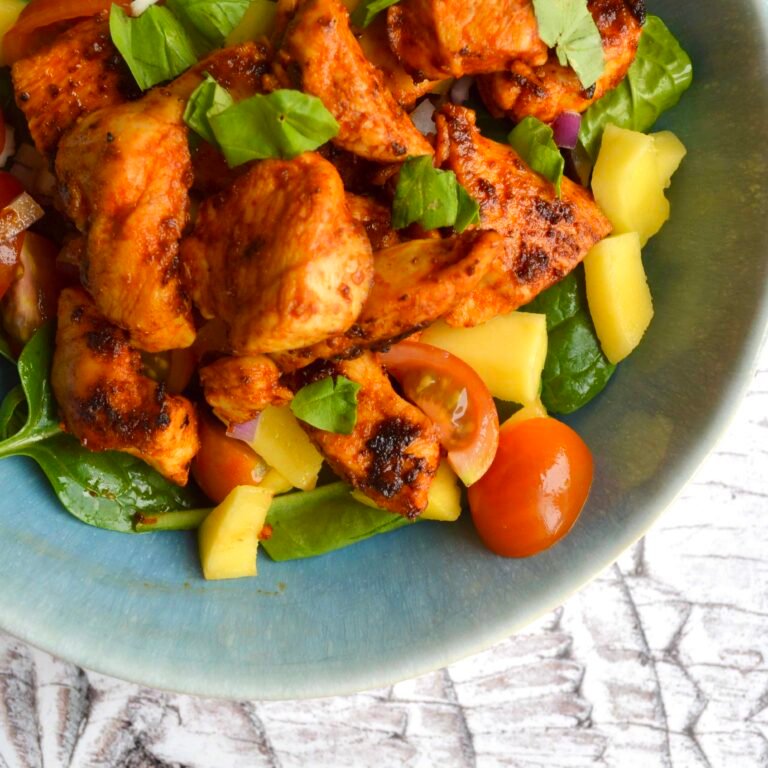 Today’s recipe is for this delicious chicken and mango salad. I’m going through a little of phase of adding mango into savoury dishes – last night I had BBQ pulled pork tacos with mango salsa for dinner. The marinade on this chicken makes it super tasty but also keeps it really tender. You can prep this ahead for a quick weekday lunch.