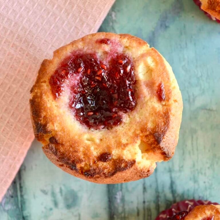 Drop some raspberry jam on the top of each muffin