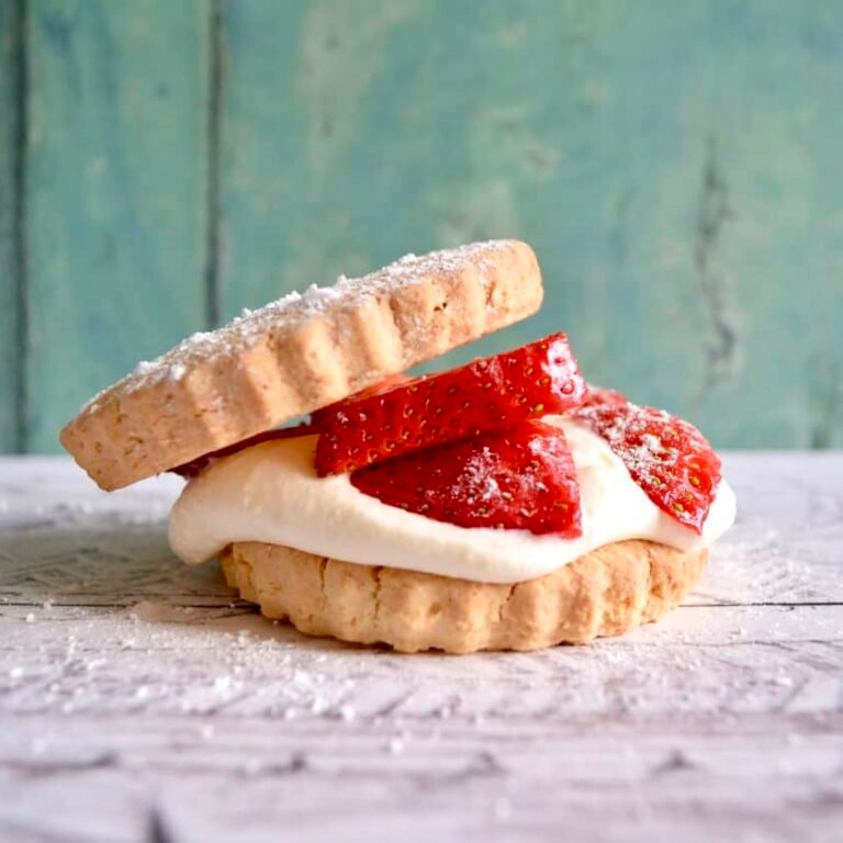 It is pretty easy to make as you can prep the shortcake biscuits ahead of time and assemble the strawberries and cream just before you serve. You can purchase the dairy free cream online – I’ve posted the details at the bottom of the recipe.