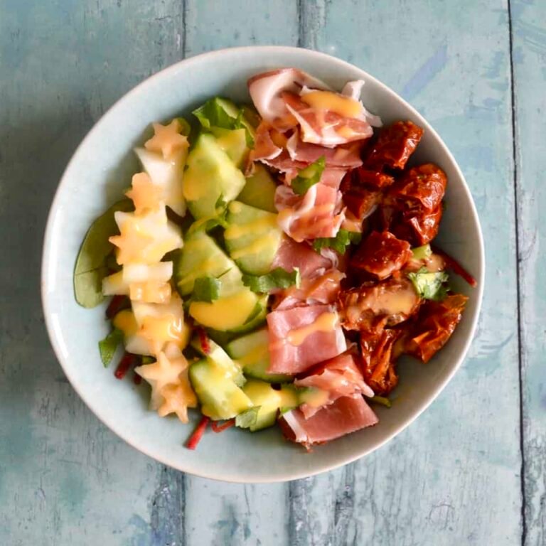 This salad bowl is packed full of flavour from the sun dried tomatoes, Serrano ham, citrusy dressing, melon and fresh basil.  Inspired by my enjoyment of this recipe I’ve also created a lovely rocket pasta salad I’ll share in the next few weeks which is perfect for a packed lunch or quick dinner.