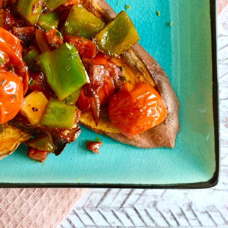 Looking for something new for lunch? Try out this easy recipe for baked sweet potatoes loaded with chorizo and Mediterranean vegetables. Remember to double check your chorizo is dairy free as it sometimes can contain milk.