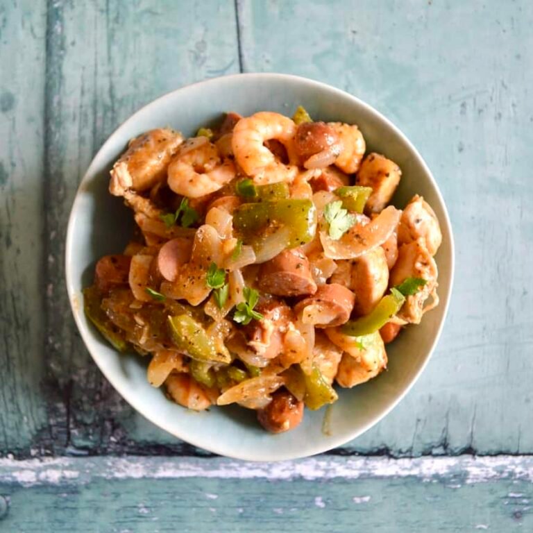 Tonight’s dish is the ultimate in making something from bits and pieces I had in the fridge and it actually working out really well.  Cajun flavoured prawns, chicken, smoked sausage and lots of vegetables is perfectly accompanied with either some rice or salad and fries.