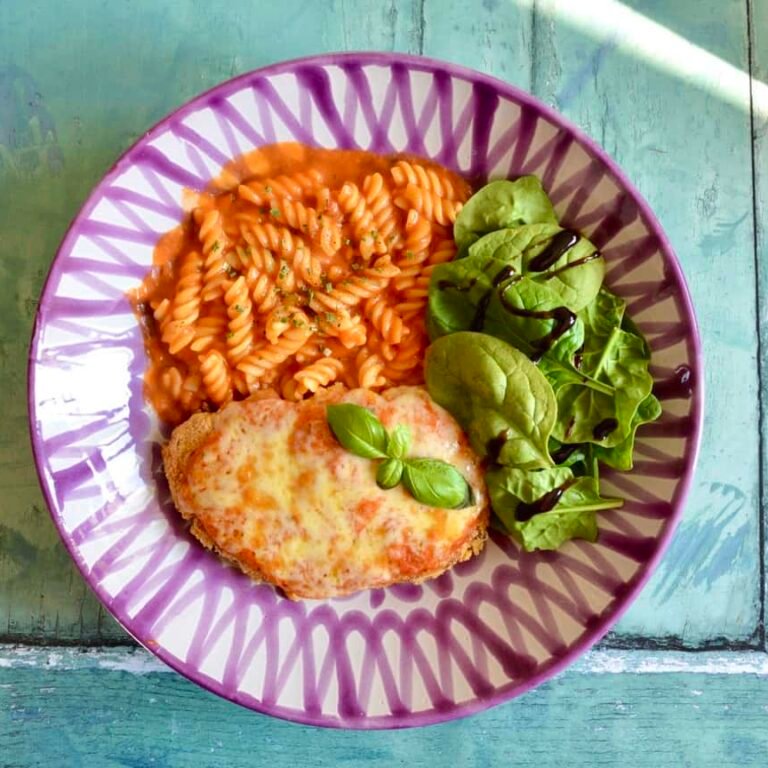 This is my take on chicken parmesan but I felt that I couldn’t call it that given it is dairy free! I’ve chicken breast coated in crispy gluten free breadcrumbs and baked topped with a tomato sauce and dairy free cheese. I also served mine with a side of pasta and some fresh spinach.