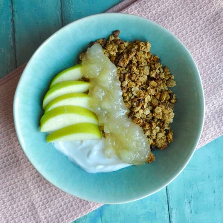 I’ve used my homemade granola recipe which is ready in under 30 minutes. Topped with juicy apple sauce and served with dairy free yoghurt. It is one of my favourite go to recipes.