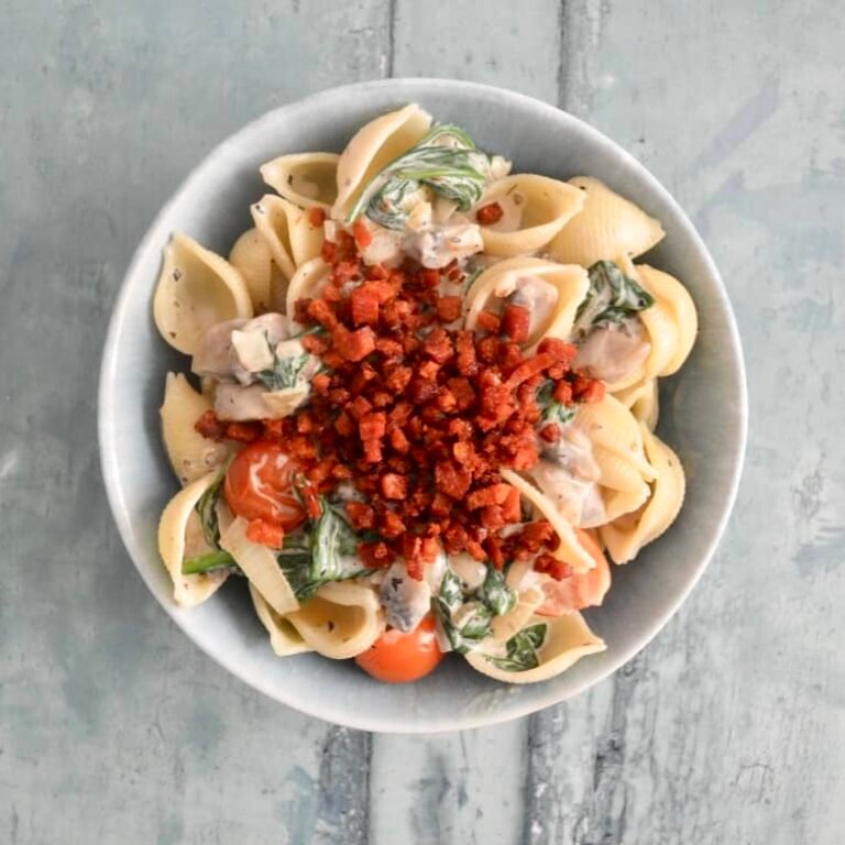 My newest pasta creation shows how much I love chorizo and there is a lot of it on top of this pasta dish! Watch out as some chorizo does have sausage in the ingredients but it is easy to find ones that don’t in the supermarket. The pasta is coated in a dairy free creamy sauce with tomatoes, onion, mushroom and spinach – a quick week night meal without compromising on the flavour.