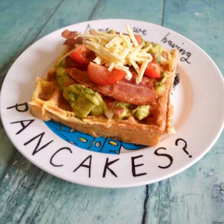 I’ve used a basic omelette mixture to make these fluffy waffles and topped them with crushed avocado, smoked bacon, tomatoes and dairy free cheese.