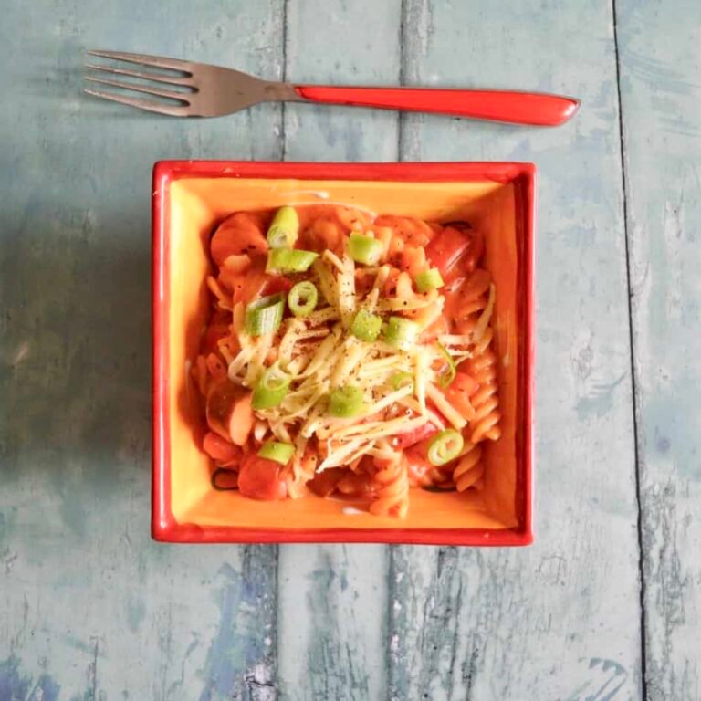 The beauty of this dinner is that it is all cooked in one pot – so if like me you hate washing up – then this dish is for you. I’ve added onion, peppers and smoked sausage to this pasta but you can really add anything you like – some bacon would be great or you can make it vegetarian.