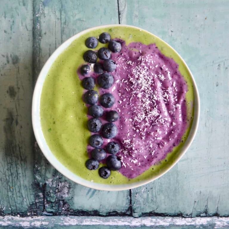 This smoothie bowl is easy to make – because you make the pale green layer first you don’t even have to bother with washing the blender before you make the pretty purple layer. I went simple with this smoothie bowl and just topped it with a few fresh blueberries. As always you can top with anything you like – I usually stick to some sort of gluten free granola and fruit combo.