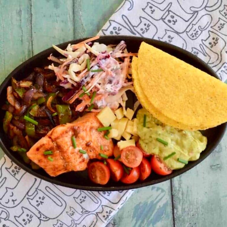 Serve with the salmon with the vegetables, taco shells, gauacamole, tomatoes, coleslaw, tomatoes and dairy free cheese